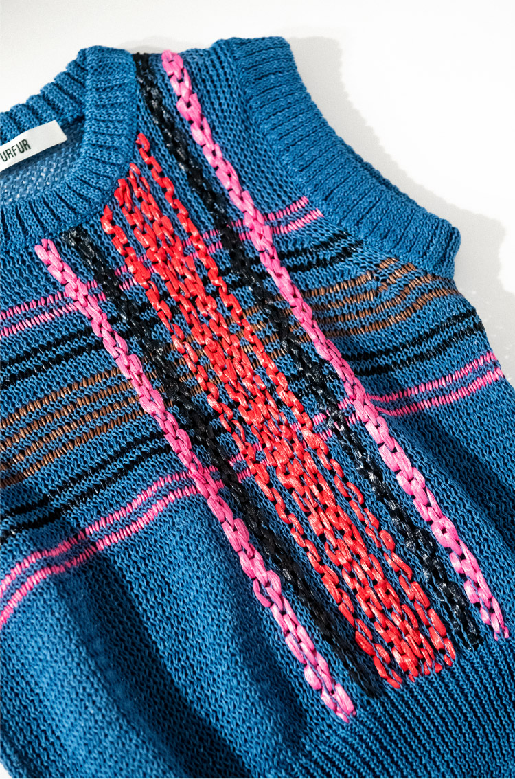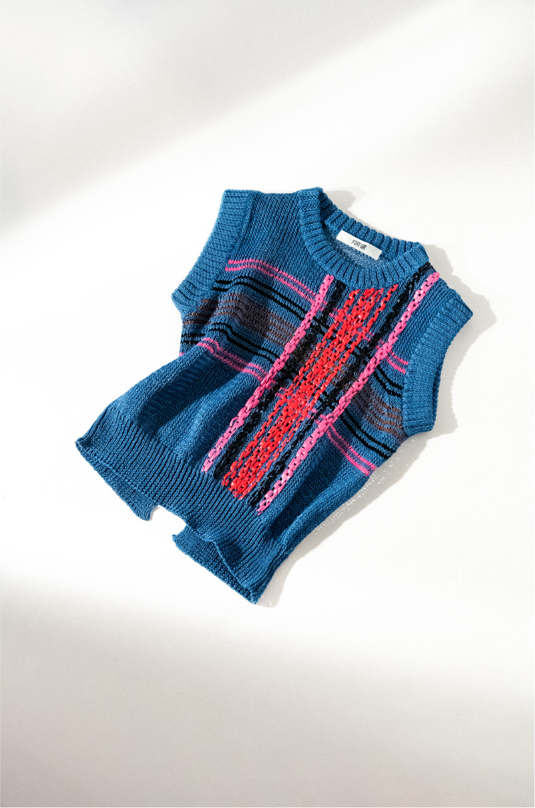 全体的にチェック柄を入れるのではなく、一部分を拡大したように大きく配置することで視線を引きつけるニットトップス。縦のラインに異素材を編み込むことで立体感が生まれ、より印象的に仕上げました。ピンクや赤のラインを使いながらも、深みのあるブルーをベースカラーにすることで、落ち着いた空気が漂います。