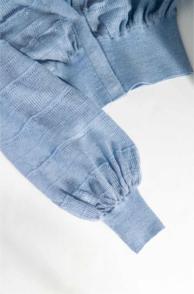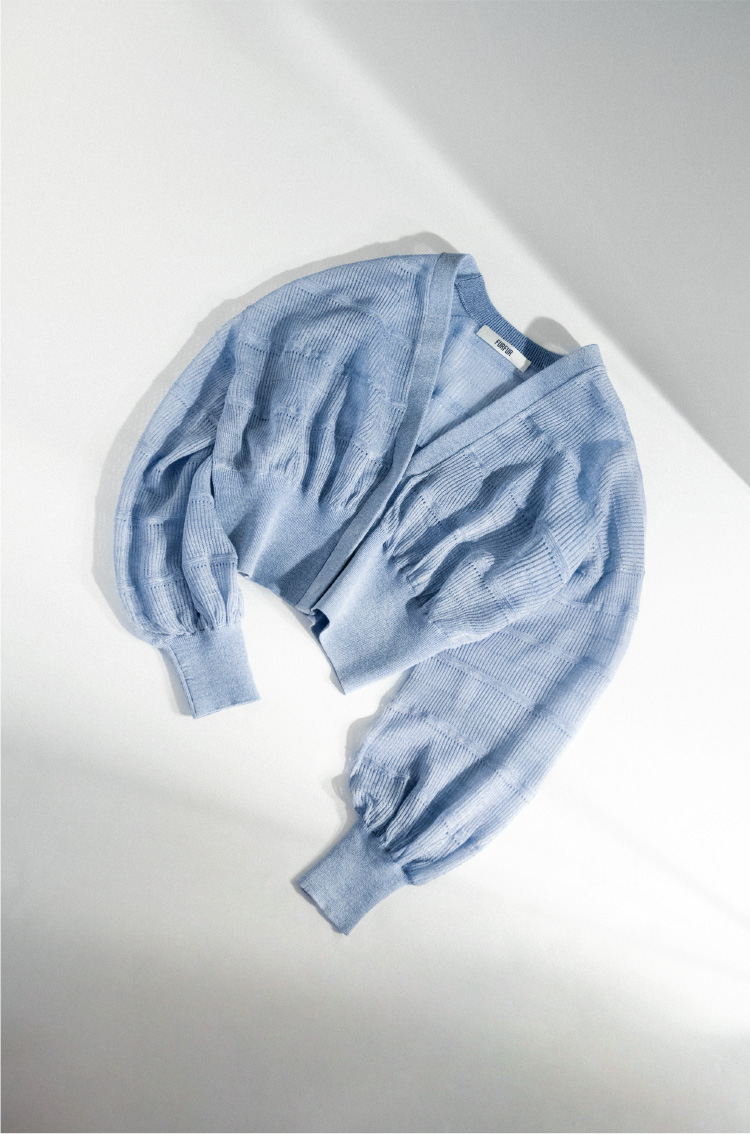 一見シンプルなデザインのカーディガンですが、細かいリブ編みが程よいシアー感を作り、旬な装いへと導きます。横に入った切り替えのラインがメリハリをプラス。どんなカラーも受け入れるダスティな水色が、少しポイントが欲しい時にもお役立ち。また、今どきなボリュームスリーブで、身頃は短めの丈に仕上げてバランスを取りやすいシルエットに。
