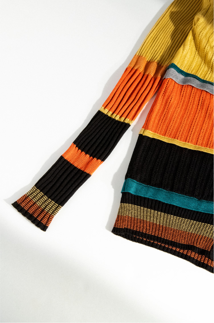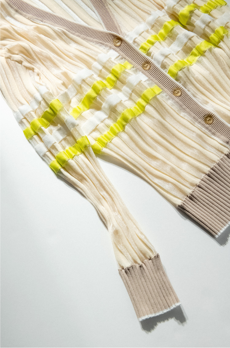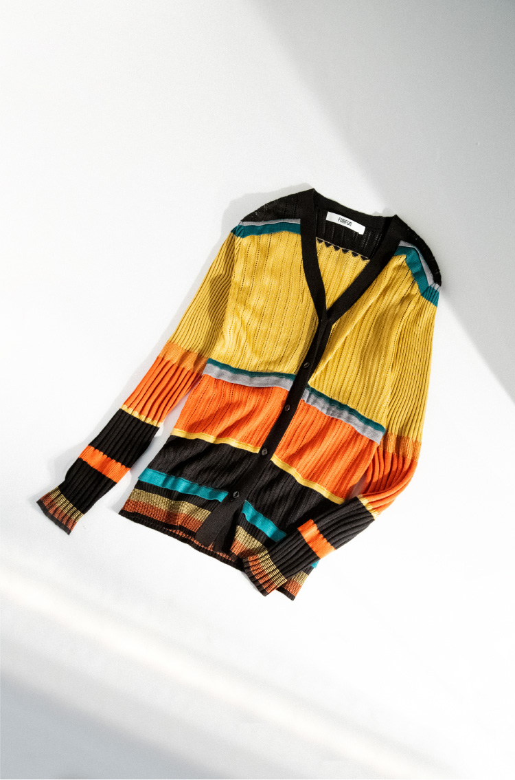 袖を通しただけで気分が明るくなる、イエローやオレンジを軸にした配色が最大の魅力。引き締め効果のある黒と組み合わせ、カーディガンのデザイン自体はミニマムにして、大人っぽくまとめました。それだけでなく、リボンを組み合わせたり、ところどころリブの細さを変えたりするなど、隅々まで計算し尽くされた特別感のある一枚です。