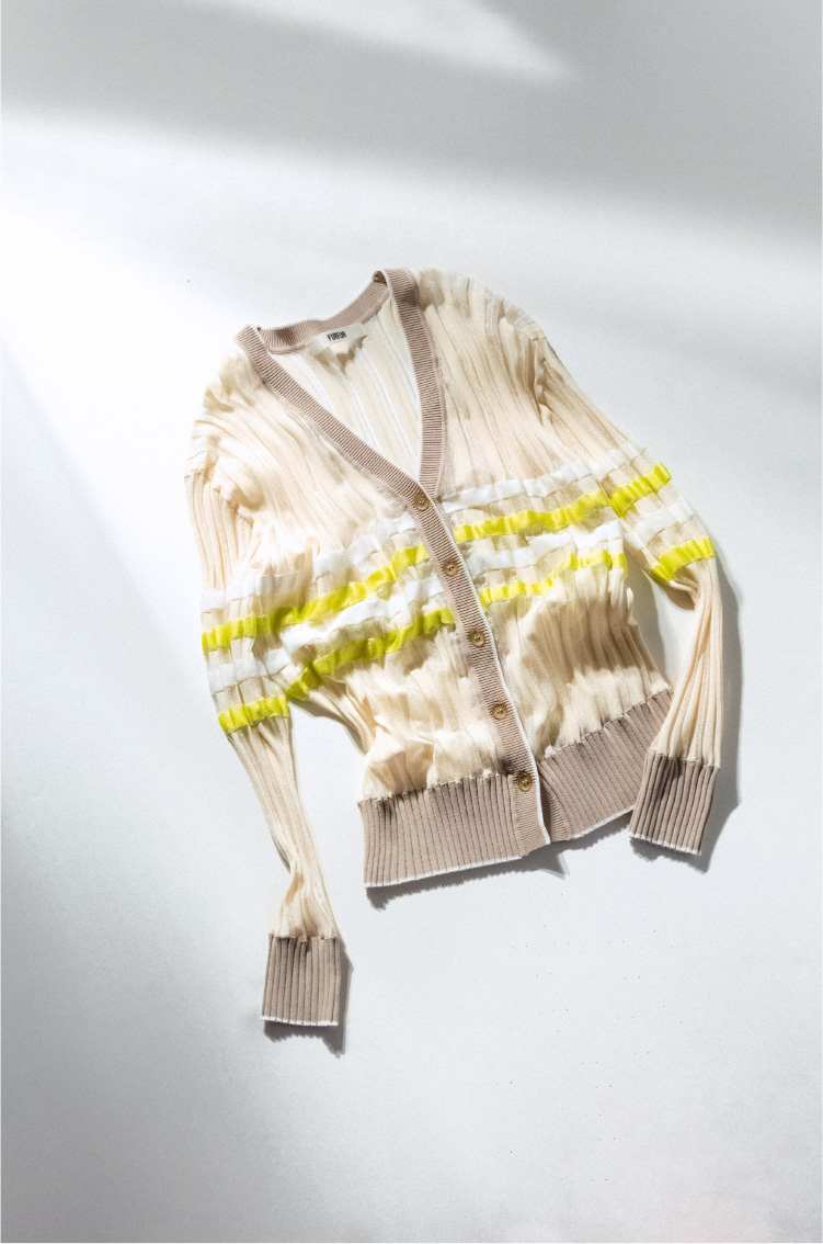 シアーな素材感が今年らしい一枚は、アイボリーカラーでよりフェミニンなムードを満喫したい。“ベーシックなカーディガン”で終わらない理由は、幅を太めに取ったリブや、クリアな白とライムカラーのラインがモードな印象をプラスしてくれるおかげ。スカートやワンピースはもちろん、メンズライクなボトムスとのコーディネートもおすすめ。
