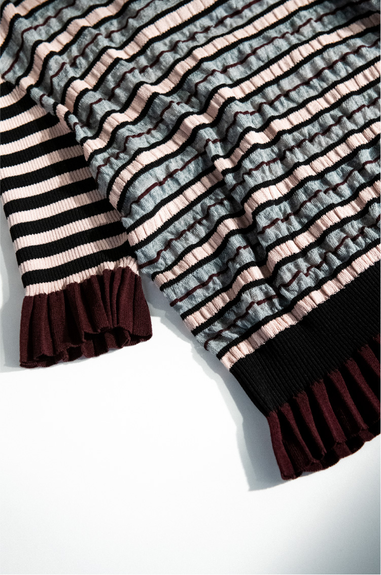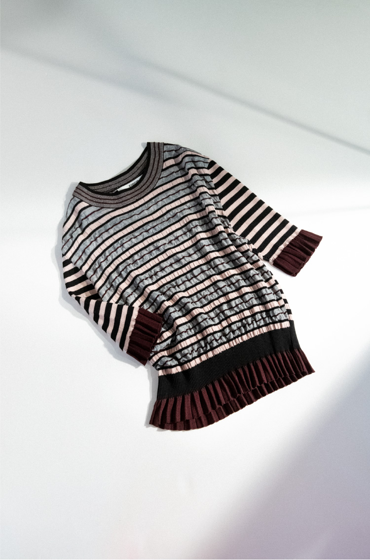 春めく淡いピンクとミントカラーにブラウンを加えて、柔らかなミックスカラーに仕上げました。バックスタイルではマリンボーダーになっていて前後で違う表情に。ピッチの違うボーダーを掛け合わせれば、自然とリズム感が生まれます。身頃はギャザーを寄せたような表情のある編み方が特徴的。プリーツ仕様の袖口や裾のあしらいで、より心踊る一枚に。カジュアルなボーダーニットが、主役級の存在感を放ちます。
