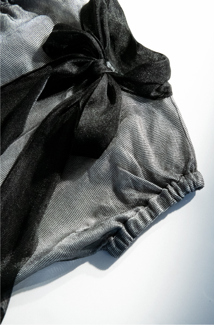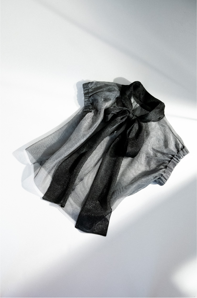 クラシカルなムードを醸し出すボウタイがアイキャッチなトップス。袖を通すとパフスリーブのようになるデザインで、大人の可愛げを添えて。重たい印象を与えがちな暖かい季節のブラックニットも、微光沢なシアー素材なら軽やかで洗練された雰囲気に。エレガントな装いにはもちろん、カジュアルに着崩すことも。幅広いスタイリングにマッチしそう。