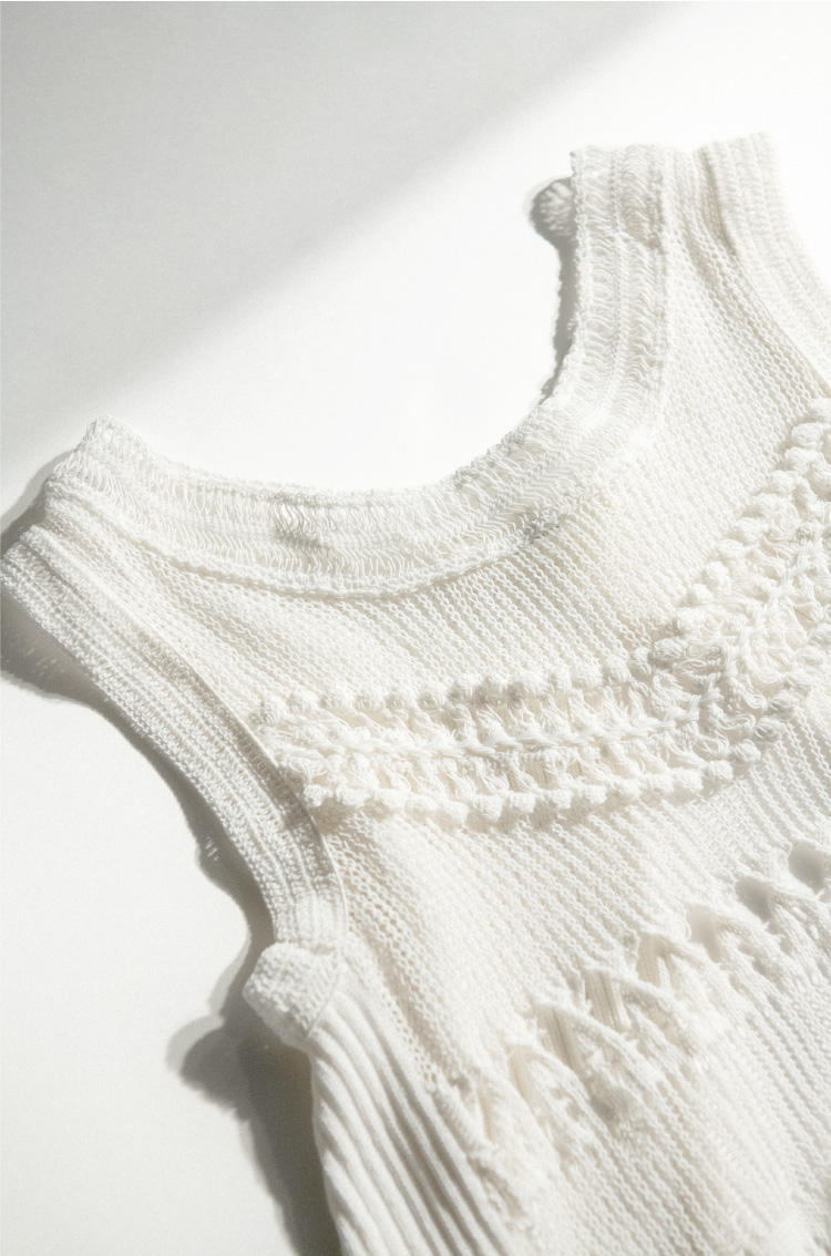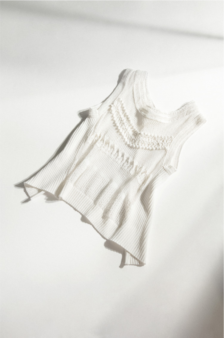 無条件に春の気分を盛り上げてくれるピュアなホワイトカラーのニットベスト。一見シンプルですが、数種類のレース編みを掛け合わせたデザインが繊細さを際立たせ、白のイノセントな魅力を後押し。女性ならではの華奢さも同時にアピール。夏になれば、ベスト一枚にデニムなどラフなボトムを合わせて、抜け感のある着こなしを楽しむのもオススメです。