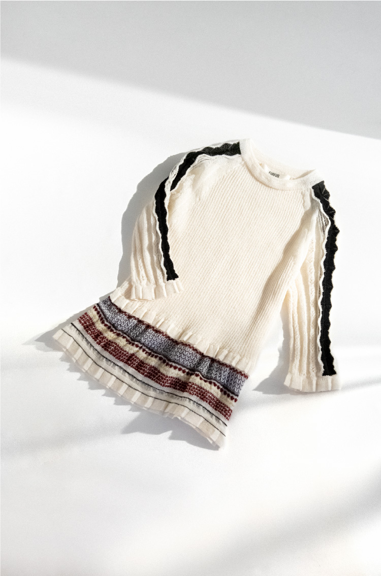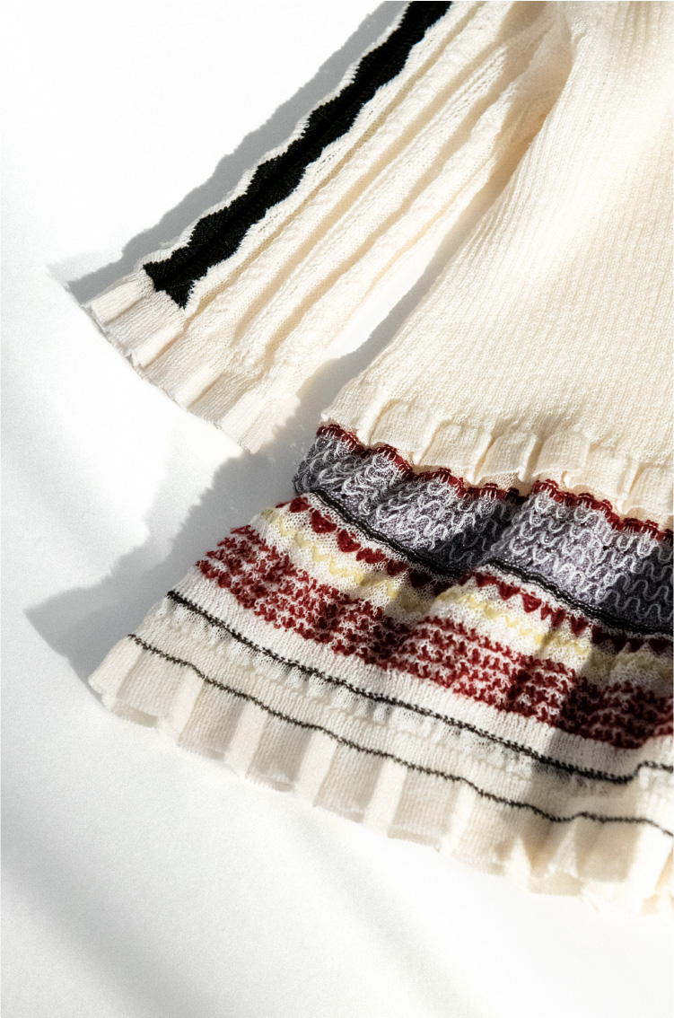 どこか野暮ったくなりがちなフォークロアテイストですが、柄を裾に留めることで都会的に引き上げます。ラインの柄やピッチ、編み方までひとつひとつこだわることで、シルエットに変化を生み全体の鮮度もアップ。さらに肩から袖にかけて入ったラインが、モードなスパイスとして活躍。新たな解釈を組み込んだエキゾチックなニットを、ぜひワードローブに迎えて。