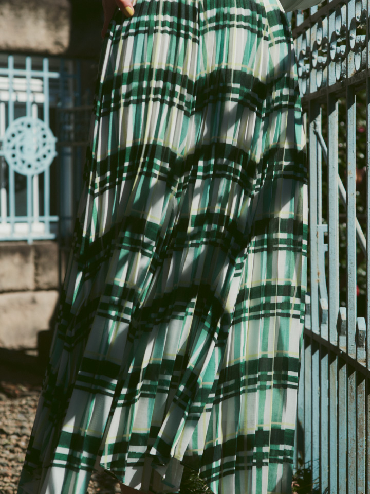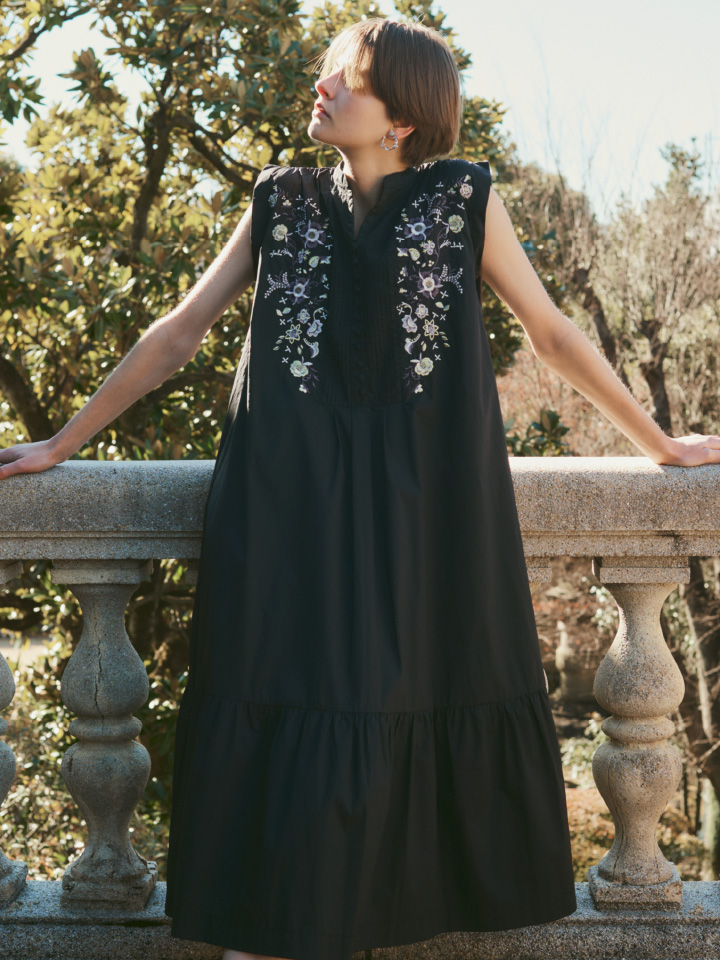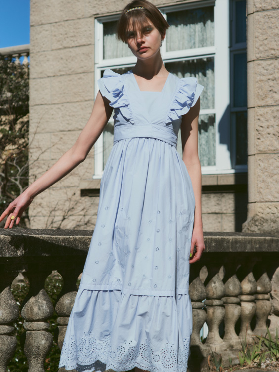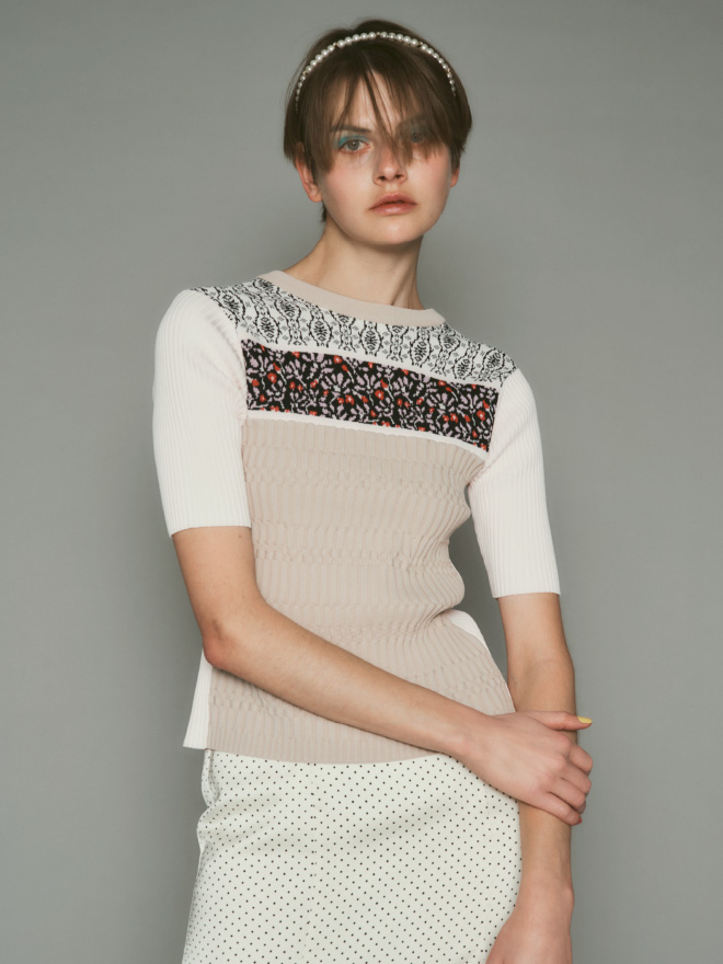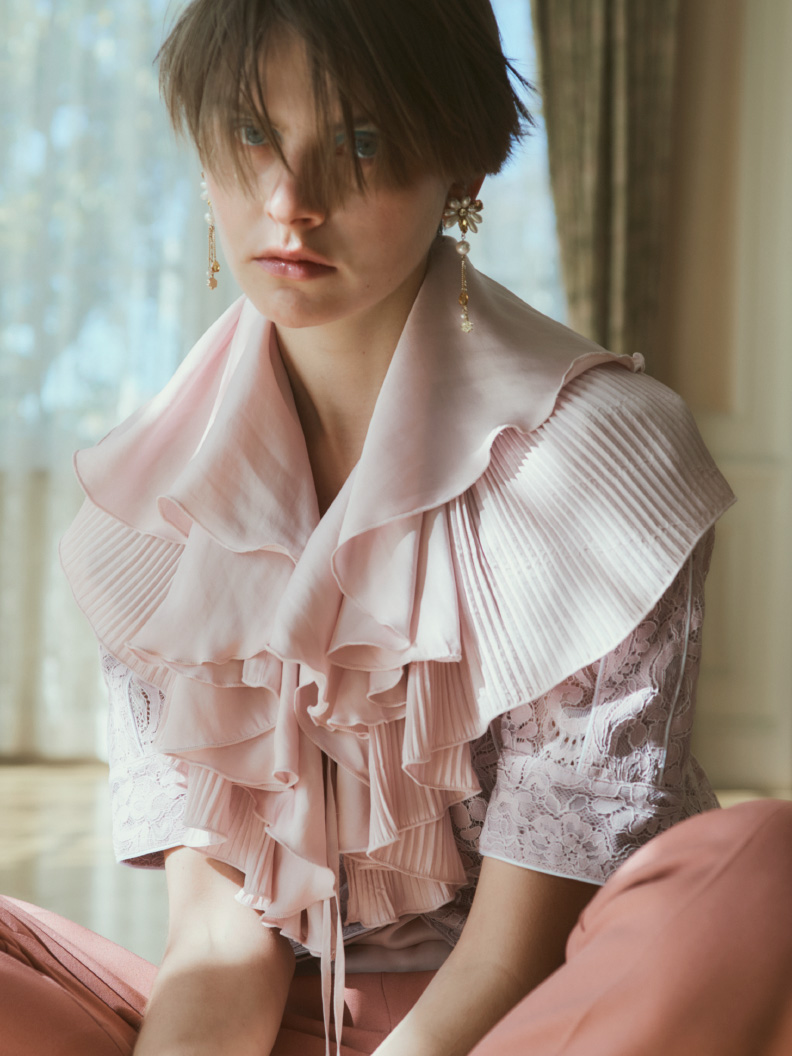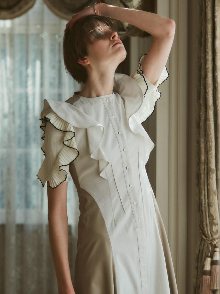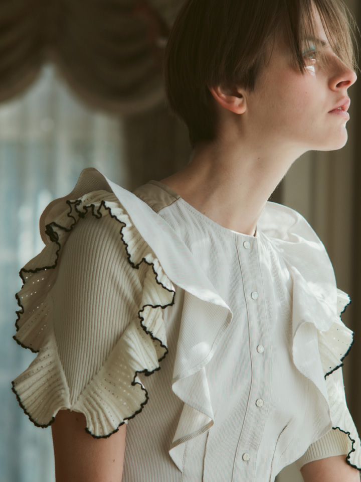 初夏の心地よい良い陽気に ふと踊りだす無邪気な私 重ね合わせた日々の彩りが 明日のステージをカラフルに盛り立てる 陽だまりの中に見る優しいグラデーション 肌に映えるフレッシュなカラー 甘く誘うフリルと合わせる構築的なボトムとのコントラスト 風と遊びだすシアーなテクスチャースカート 記憶の糸を紡いだ刺繍や 緻密なニットジャガードに身を包み ノスタルジックな気分も楽しむ 小さなステップを踏んで踊りだしたくなるような 軽やかで可憐なディテールを携えて